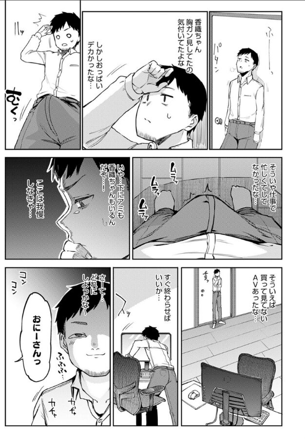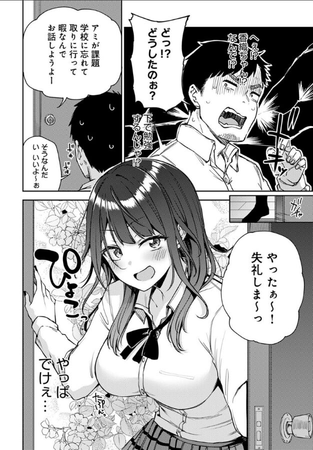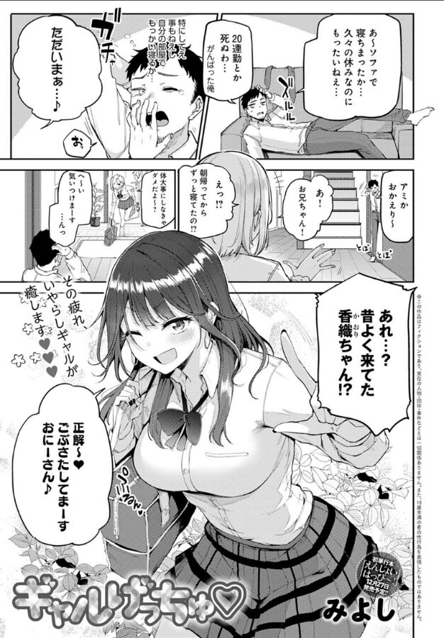 久々の休日、家でぐったりしていると妹の友達・香織ちゃんが来訪!!数年ぶりに会った香織ちゃんの大成長したおっぱいについムラッとしてしまい、自室で解消しようとした瞬間…香織ちゃんが部屋にやってきた!妹が忘れ物を取りに家を出ている間にお話ししたい、という香織ちゃん。最近の激務っぷりを話すと、香織ちゃん直々にマッサージしてくれるというので、お言葉に甘えることに♪至近距離で見る爆乳とリラックスも相まってつい勃起してしまった主人公に、「溜まってるって正直に言えば’手コキ’してあげる」と迫ってきて–!?いたずらエロっ子を描かせたら天下一品! みよし先生描く、妹の友達からお疲れおち○ぽ癒し抜き☆