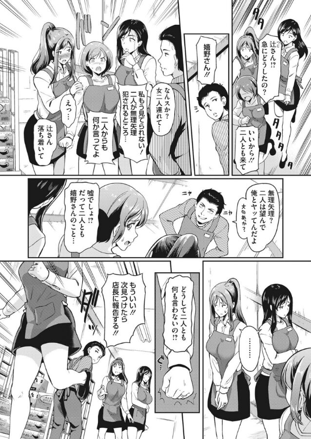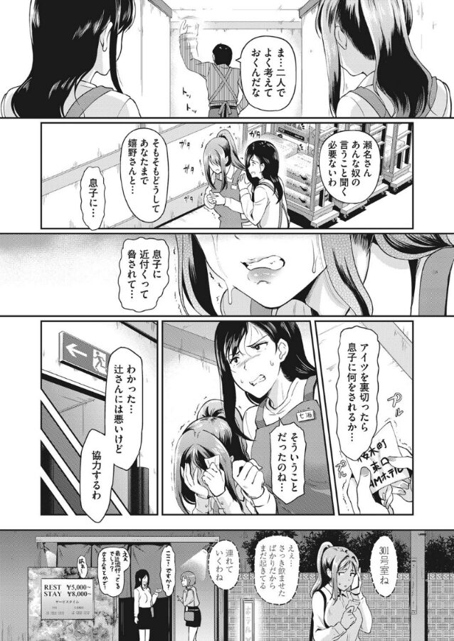 嬉野は七瀬、瀬名とパート女性を次々に食い物にしている。次は私の番かと恐る辻は、2人を連れて嬉野を訴えるが、2人は黙ったままだ。逆に嬉野は2人を使って辻をハメてやろうと、2人に辻を連れてくるよう迫る。まんまと嬉野の待つホテルに連れ込まれてしまった辻は眠らされ、2人の見ている前で嬉野と辻のセックスが始まった。