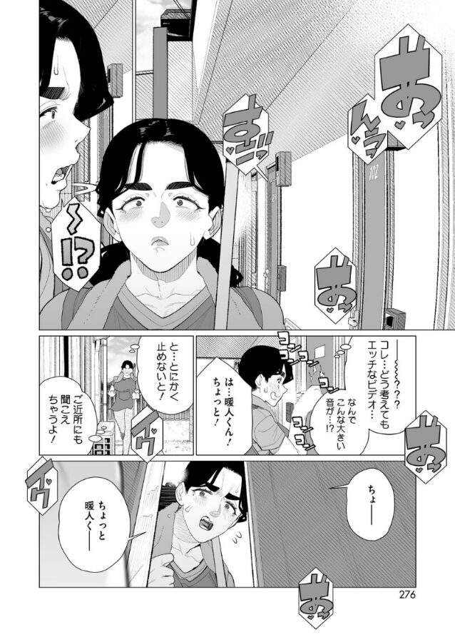 アパートの一室から、いやらしい声が漏れ聞こえてくる。音の発生源と思われる部屋のカーテンの隙間から様子を伺う大家のおばさんは、息子と同じくらいの年の住人・暖人くんがAVを見ながらオナニーをしているのを発見してしまう。どうやらヘッドフォンが繋がっていないことに気づいてないらしい。それにしても立派なおち●んちんについうっかり釘付けになってしまう