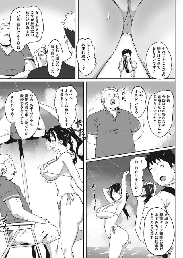 八場は初めてのグラビア撮影に同行していた。待ち合わせていたのは入江あずみというグラビアアイドル。波打ち際で水着になると朝と雰囲気がガラッと変わり、弾ける巨乳と笑顔を見せつけている。好きなように動いてと声をかけると、なぜか背中を向けてヒップを突き出し、八場にアナルのシワまで見せつけて…?!