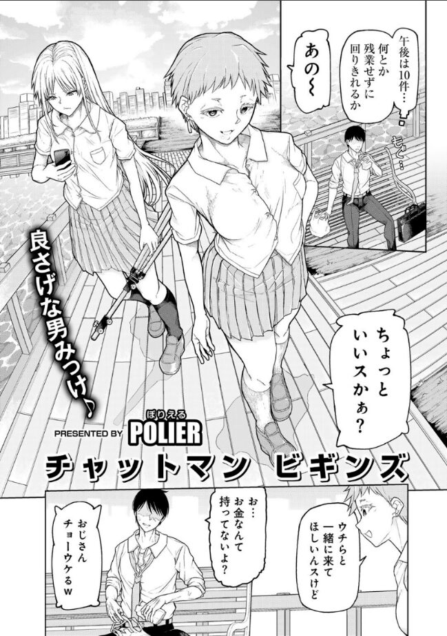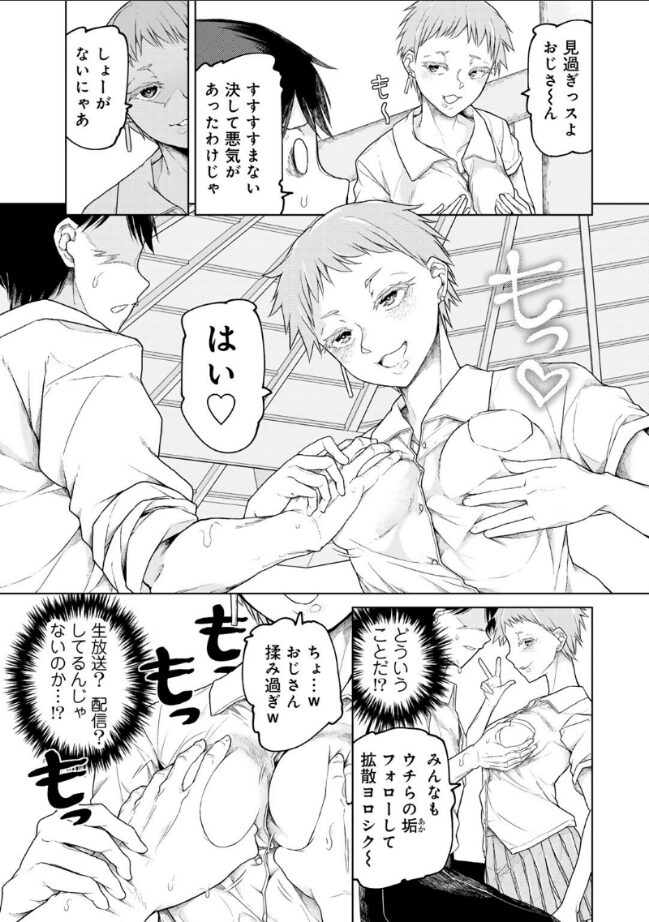 女子校生2人と生ハメ配信!仕事の昼休み中に、2人の女子校生に声をかけられた冴えない会社員の青年。彼女たちに強引に連れられ、エロ配信の手伝いとして竿役をする事になってしまう。配信内で視聴者から届く高額スパチャの命令は絶対遵守!視聴者の指示で、陽キャのナエミとクールなマユ、タイプの違う2人の女子校生に口内射精、孕ませピストンをする事になる!レッツ・生ハメ配信スタート♪(COMICグーチョvol.23 掲載作品)