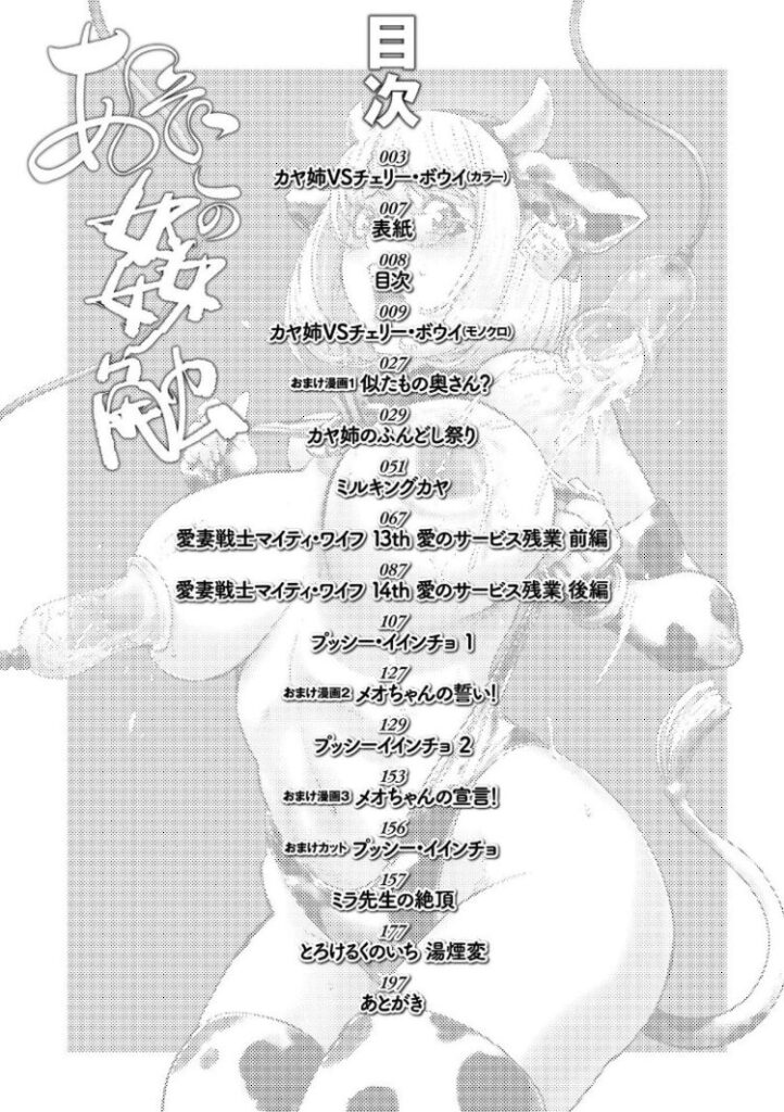巨乳妻を描き続ける作家、蒟吉人(KON-KIT)単行本最新刊!ファン待望のカヤ姉シリーズに、愛妻戦士マイティ・ワイフ、その義妹のJKイインチョまで!美乳、巨乳、爆乳勢揃い!!★収録作品★【カヤ姉VSチェリー・ボウイ】【おまけ漫画1 似たもの奥さん?】【カヤ姉のふんどし祭り】【ミルキングカヤ】【愛妻戦士マイティ・ワイフ 13th 愛のサービス残業 前編】【愛妻戦士マイティ・ワイフ 14th 愛のサービス残業 後編】【プッシー・イインチョ 1】【おまけ漫画2 メオちゃんの誓い!】【プッシーイインチョ 2】【おまけ漫画3 メオちゃんの宣言!】【おまけカット プッシー・イインチョ】【ミラ先生の絶頂】【とろけるくのいち 湯煙変】【あとがき】イヤよイヤよと言いつつも、腰を振りながら向かい入れてしまうオンナたち。彼女たちのあそこ具合を体感せよ!!