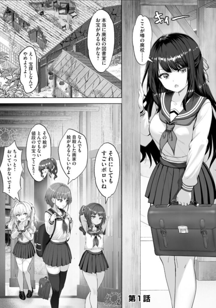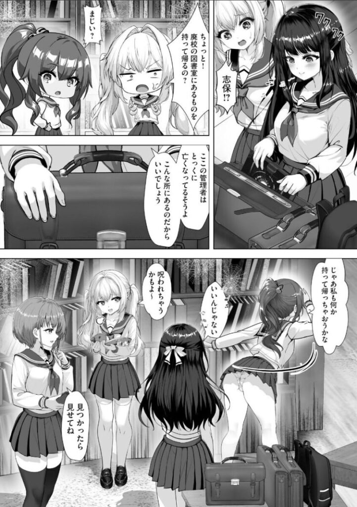 「廃校の図書室に、亡くなった画家の高額な絵画がある」…怪しい匂いのする噂を聞きつけ、宝探し感覚で廃校に忍び込んだ4人の女子――オカルト研究会の志保、軽音楽部のクール系女子・瑠香、水泳部のエース・あきは、良家のお嬢様・みゆの4人。そこで不思議な本を見つけた彼女たちは、闇の奥底から何者かを呼び起こしてしまう――!?