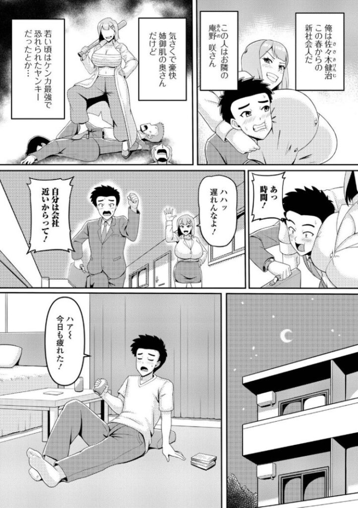 就職してまだ日が浅いサラリーマンの健治(けんじ)は今日も寝坊する。慌てて出勤しようとする彼を見送ったのは隣部屋の元ヤン人妻の咲(さき)だった。◆夜、帰宅した健治の部屋に酒に飲まれた咲が倒れ込むように入ってきた。自分の部屋と間違えたらしい…寝返りを打った拍子に彼女自慢の爆乳が目に入る。さらにシャツのボタンが弾け、人妻OLらしい黒のレースが入ったブラが!これは絶好の機会とばかりにブラを下げ、赤子のように乳首を啜り始める…!※この作品は「コミック刺激的SQUIRT!! Vol.61」に収録されている作品の単話配信です。