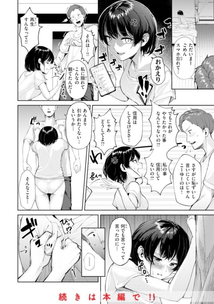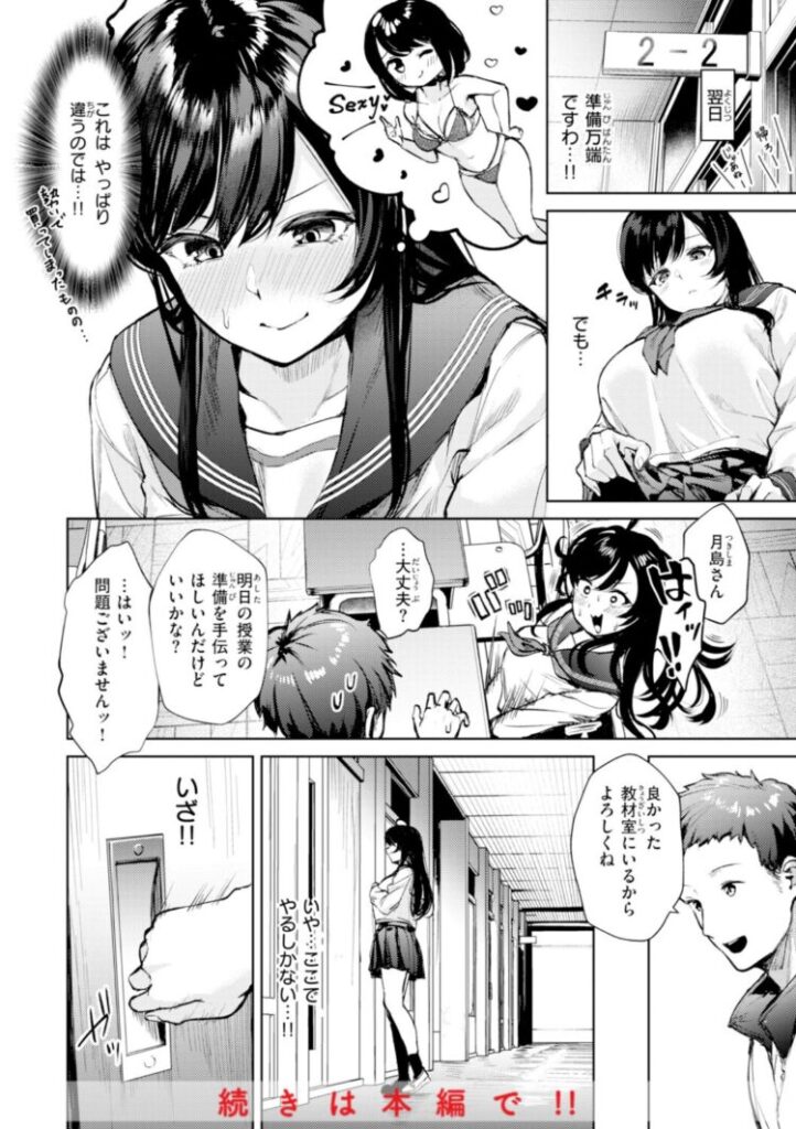 体操部の鹿沼くんは、男子が一人しかいないという理由でいつも体育館の隅の方しか使わせてもらえず、女子のエースたちに文句を言うと、更衣室に呼び出され、ストレス解消のために責められてしまうところが面白かったです。 全裸にされ、ゆか運動で使うためのリボンで手首を拘束され、抵抗できないようにした上での女子二人からの責めは、鹿沼くんにとってすごく屈辱的なものである一方で、身体はギンギンに反応してしまうというギャップがよかったです。 イキたいのにイカせてもらえない状態で、おっぱい舐めを強制されたり、レオタード越しに股間を押しつけられたりと精神的にはハードな展開ではあるものの、二人が散々弄り倒したあとに、可愛い部長が優しく慰めてくれるところもあり、アメとムチのバランスが取れていると思いました。 |