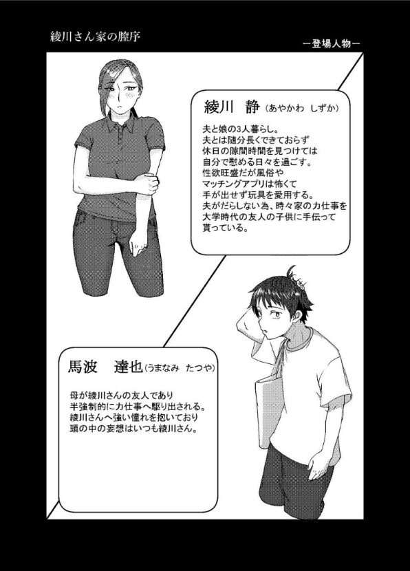 【私が抜いたげよっか?】日差しが照りつける盛夏の日―肉欲に溺れ一人慰める人妻 綾川 静(あやかわ しずか)は家事の手伝い来てもらった友人の〇供、馬波 達也(うまなみ たつや)に自身が使用した玩具を見られてしまう。若い身体の男は収まりを知らず、意図せず反応してしまう。傷つけぬよう接しようとする綾川さんはトイレで収めてもらおうと提案するが…彼の想い人は「綾川 静」自身だったー。若男から向けられた熱い欲情に抗おうとする彼女だったが為す術もなく彼女は肉欲の間へと堕ちていく―――。46ページ