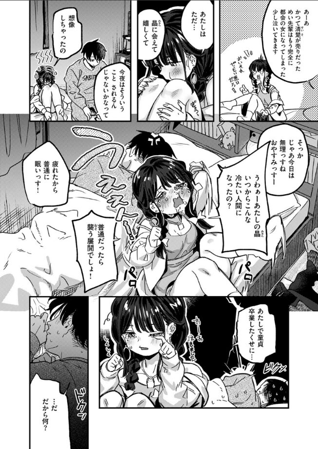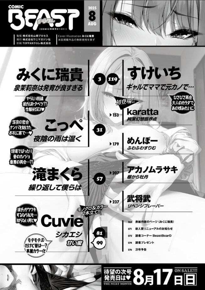 パックリめくって…オキニを見つけて?アソコの治療ファンタジーや体操部ハーレムなどなどやわらかおっぱい盛りだくさんな夢いっぱい号!!「…前からずっと そういう目で見てたってこと?」気持ちもカラダも重なる、性と純愛の青春ラブストーリー♪ 表紙&巻頭はみくに瑞貴『泉茉莉奈は発育が良すぎる』豊満なボディに悩むスポーツ娘・泉茉莉奈(いずみ まりな)は、幼なじみで彼氏の樹(いつき)とずっとプラトニックな関係。ある日、女友達に自分の体のエロさをからかわれたのをきっかけに、「樹は性欲ばっかの他の男とは違うって、証明してやる…!!」と、あの手この手で色仕掛けを開始!当然スルーしてくれると思っていたのに、突然、彼が抱きしめてきて……?「晶(あきら)なら絶対すごい監督になれるから あたしが卒業しても撮影やめないでね」複雑な気持ちがあふれ出る……。待望の新作、滝まくら『繰り返して僕らは』学生時代、映画同好会の先輩・めい先輩に恋をした。初体験の相手も先輩だった。でも僕たちはお別れした。……はずだった。そのはずだったのに、仕事現場のエッチな撮影でモデルをしているめい先輩と再会してしまった。しかも打ち上げの飲み会でベロベロに酔っぱらっためい先輩を連れて帰る流れに。「上京して女優になる」って言っていた先輩がなんで今《この仕事》を……。注目は、Cuvieのモノクロ&カラーの豪華2本立て!新作の彼氏の浮気をきっかけにワンナイトSEX&フルカラーで送る同級生とのナイショの関係をお見逃しなく♪公園で出会ったノーブラのお姉さん。ある日、ナンパから助けたら突然キスされて……こっぺ『夜陰の雨は温く』大好きな会社の先輩が、エロ配信者だったなんて……karatta『純潔幻想臨界点』病んだ時はエッチするに限る。そんな地雷友達が連れてきたのは、まさかの元カレ!?……武将武『リベンジフレーバー』<表紙作家>みくに瑞貴<収録作品>泉茉莉奈は発育が良すぎる/みくに瑞貴夜陰の雨は温く/こっぺ繰り返して僕らは/滝まくらシカエシ/Cuvie甘い蜜【フルカラー版】/Cuvieギャルでママで元カノで…/すけいち純潔幻想臨界点/karattaふわふわすりむ/めんぼー棚から牡丹/アカノムラサキリベンジフレーバー/武将武