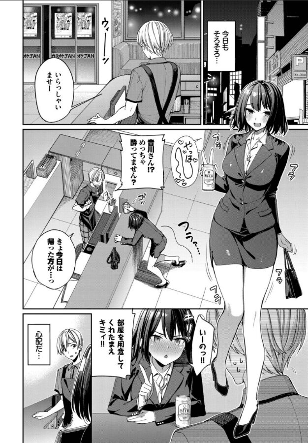 カラオケ店でバイトする卯川くんは、お店の常連で気さくに話し掛けてきてくれる美人OLの音川さんに恋をしていて、彼女が来る時間になるとソワソワしてしまうところがピュアで可愛かったです。 しかし、その日はお酒を手にベロベロの状態で来店し、注文されたドリンクを部屋に持っていくとスヤスヤ眠る彼女がいて、可愛さに見惚れると同時に、このまましゃがみ込めばスカートの中が見えるのでは?というエッチな気持ちに負け、こっそり覗こうとした結果、実はそれは彼女の仕掛けた罠で、バイト後に呼び出されてしまうという展開にドキドキしました。 しかも、嫌われてしまったと思い悩む彼が向かった待ち合わせ場所はなぜかラブホで、濃厚なフェラや手コキという応酬を受けるだけでなく、主導権を握った彼女から徹底的に絞り取られてしまうところがよかったです。 |