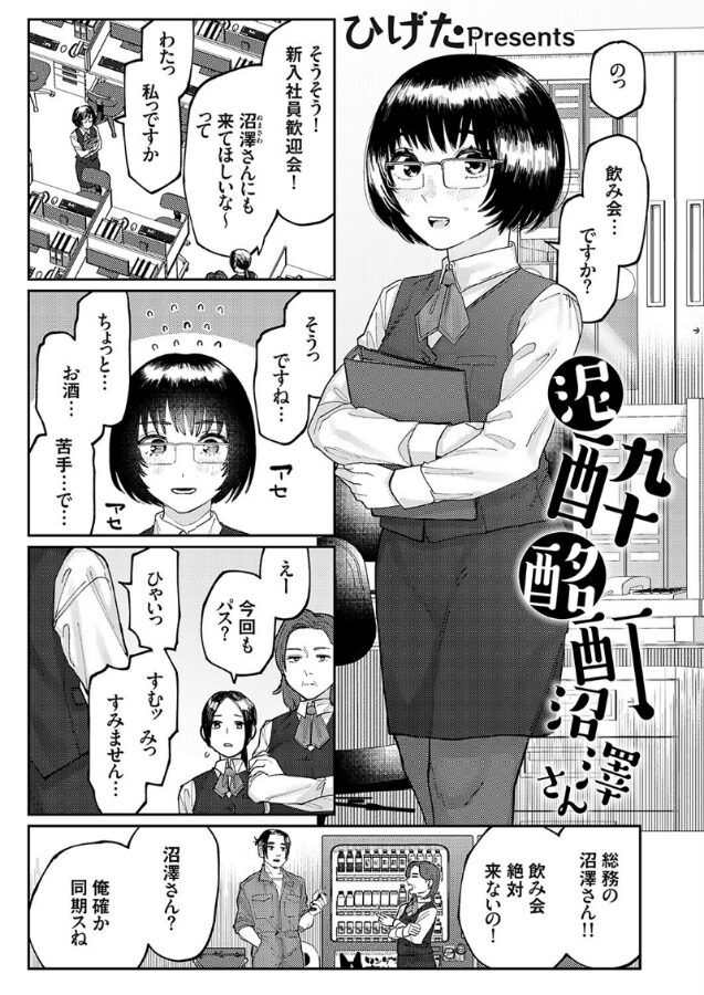 GOT初単行本『はいぼるてーじ!』が絶賛発売中のひげたがギャップありすぎなへべれけOLとの行きずりセックスをお届け!総務の沼澤(ぬまさわ)さんがあまりに会社の飲み会に出席しないため、同期だからという理由で先輩OLにサシ飲みに誘うように言われた主人公。仕方なく仕事終わり居酒屋に誘い、いざ飲み始めると最強に酒癖が悪いことが発覚。パンツは丸見えだし、絡みはだるいし、酒はこぼすし、そりゃ会社の飲み会に出席できないわ…と考えていたらあっという間に閉店時間。しかし沼澤さんは帰るそぶりを微塵も見せない。完全に出来上がった沼澤さんは主人公宅まで着いてきて、そのまま飲み直すことに。お酒をこぼし汚した服のままの沼澤さんを着替えさせようとすると「ヤレるって思ったでしょ!」と言われ…「そうだったらどうする?」と様子を見るも意外とイケそう…!?職場では絶対に見れないへべれけだけど可愛らしい沼澤さんと一夜限り(?)の関係が今始まる…!