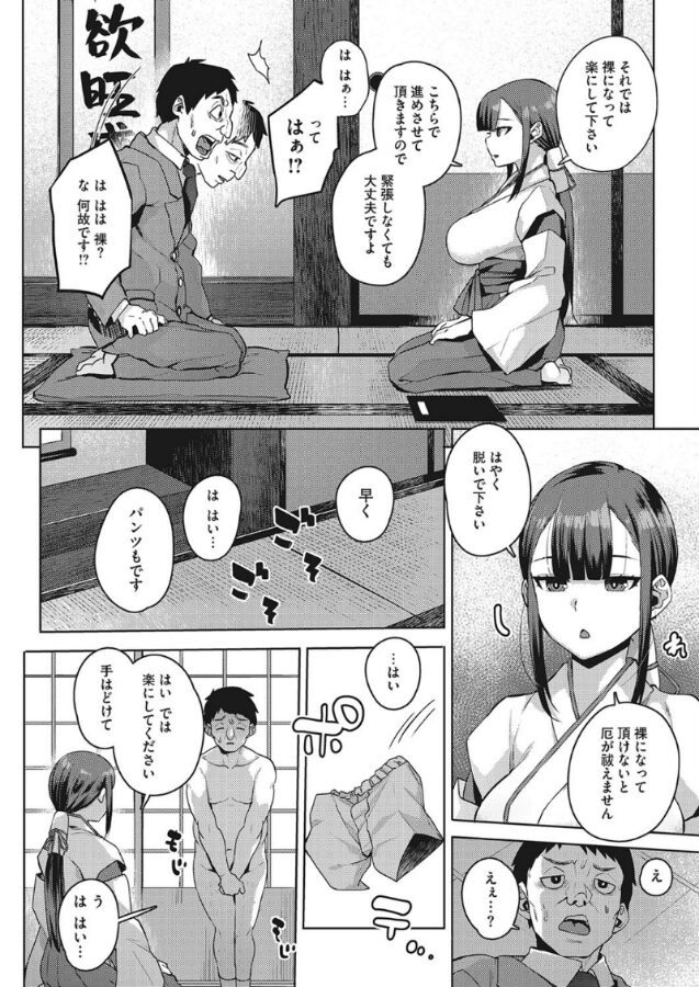 とある神社に、厄払いの相談に来た男。巫女に相談すると、巫女は裸になって横になれという。パンツも脱いで全裸になると、巫女は男のチ●ポを見て大分溜まっているといい、いきなりチ●ポを舐めはじめた。躊躇する男に巫女は、陰嚢に厄が溜まっているので吐き出す必要があるというのだ。巧みな舌使いでチ●ポを扱きあげ、たまらず勃起してしまう男に、下半身が裸の巫女が跨ってきて…。