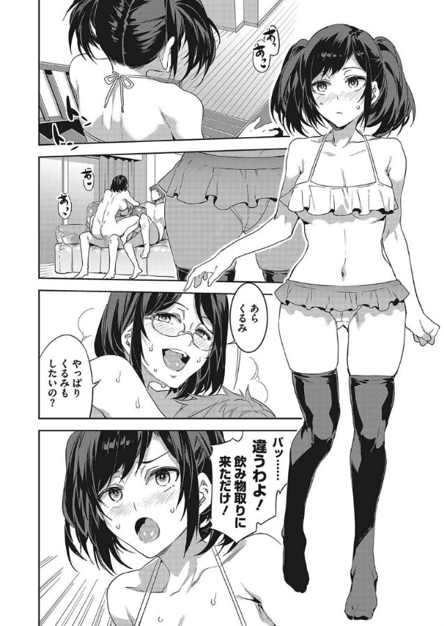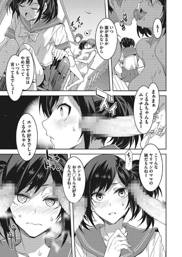 汗が噴き出すド暑い炎天から自宅に戻れば、玄関でママが男と犯りまくっている。もう玄関でヤルのは止めてッ…と怒りながら部屋に入ったくるみもヤリたくなってマン汁がこぼれる。リビングに行ったら目の前に勃起肉棒を突き出されて、こうなったらヤラずにいられない。ママの娘だもの。
