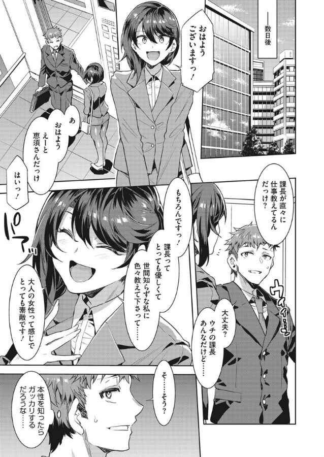 新たに配属された若手女性を、課長が直々に指導することになった。課長の槍間さんと名前を聞いただけで、男性スタッフは背筋が寒くなる。さっそく新人と男性が資料室に呼ばれ、仕事の内容よりもコミュニケーションの大切さを教わるのだった。股間をまさぐり、咥え込む課長に合わせ、変態衣装を身につけた新人は勉強になります…と応じ、フェラをこなし、ヤリマン好色な課長を見習ってハメ漬け勤務に励むのだった。